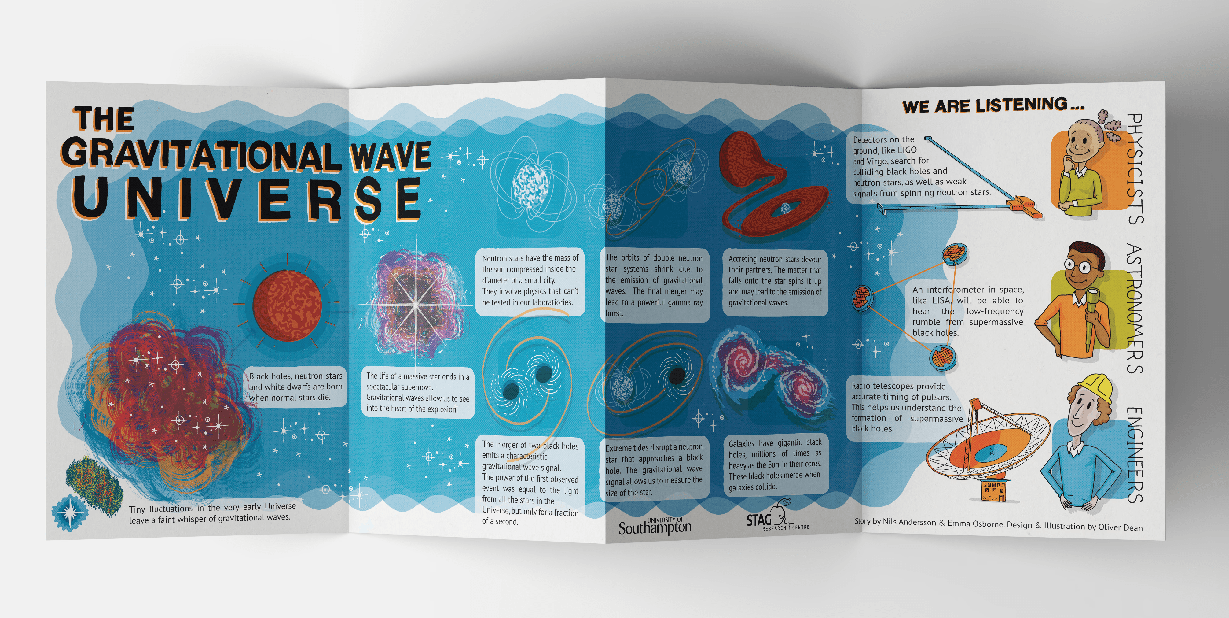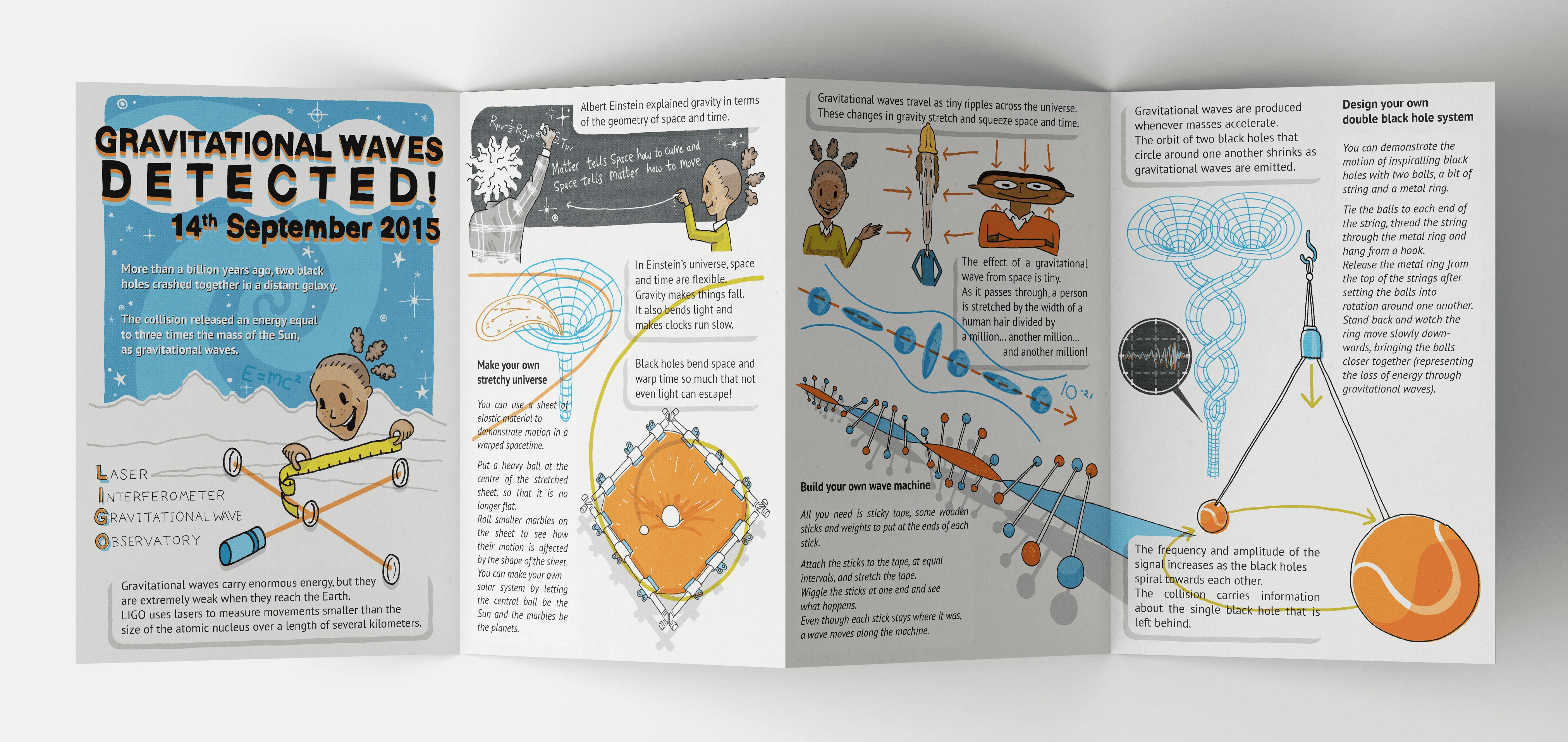 An 8 page digital and printed concertina leaflet about gravitational waves, including demonstrations to try at home and sources of gravitational waves in the universe.